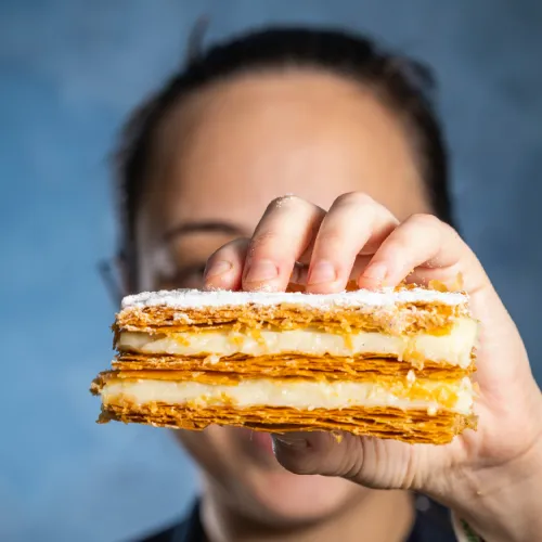 Somos Thaís e Ícaro, casal de confeiteiros apaixonados por folhados. Depois de anos de experiência em pâtisseries renomadas, começamos nossa jornada empreendedora na própria cozinha de casa, com pouquíssimos equipamentos.